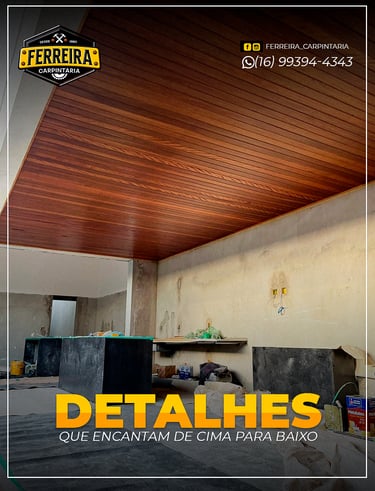 Ao projetar um espaço gourmet ou uma área de convivência, cada elemento precisa refletir qualidade e bom gosto. Um forro de madeira bem executado transforma completamente o ambiente, trazendo aconchego, requinte e valorização ao imóvel. Além de contribuir com o conforto térmico e acústico, a madeira agrega um toque natural que nunca sai de moda. A Ferreira Carpintaria é especialista na instalação de forros de madeira com acabamento impecável. Trabalhamos com madeiras nobres, encaixes precisos e tratamento adequado para garantir durabilidade, beleza e resistência ao longo dos anos. Cada projeto é executado com atenção aos detalhes e respeito ao estilo arquitetônico do local, como nesta obra que está em fase final e já impressiona pela elegância. Quer transformar seu espaço com um forro de madeira de alto padrão? Fale com a Ferreira Carpintaria e descubra como podemos valorizar seu ambiente:📞 (16) 99168-6752
